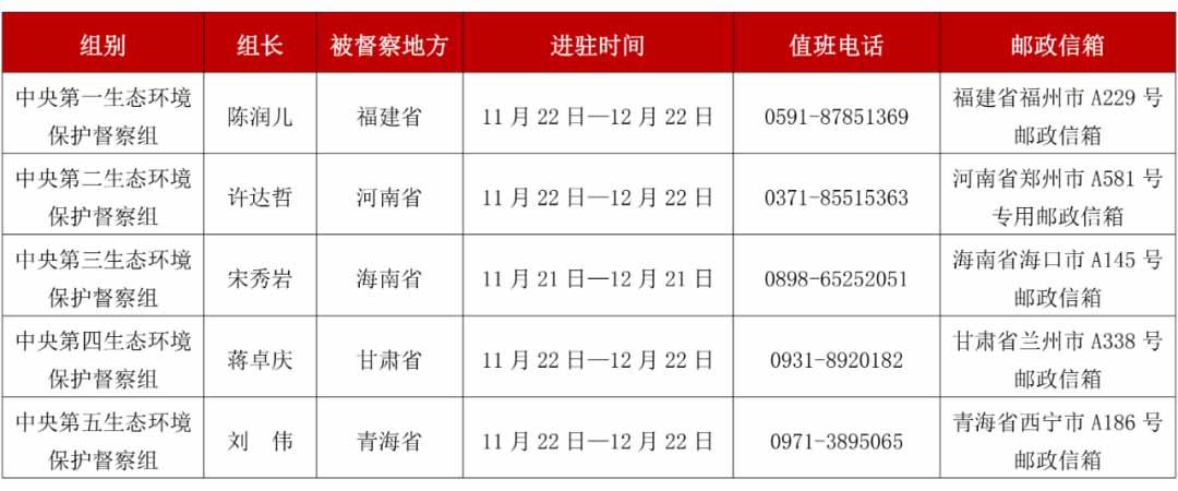 根据工作安排,第三轮第一批中央生态环境保护督察进驻时间为1个月。进驻期间,各督察组分别设立专门值班电话和邮政信箱,受理被督察地方生态环境保护方面的来信来电信访举报,受理举报电话时间为每天8:00—20:00。督察组全体成员将严格执行纪律要求,接受被督察地方和社会监督。在后续工作中,将严格落实中央有关要求,进一步为基层减负,简化程序、优化流程,不断提高督察工作的精准性、针对性,确保有序有效完成督察任务。